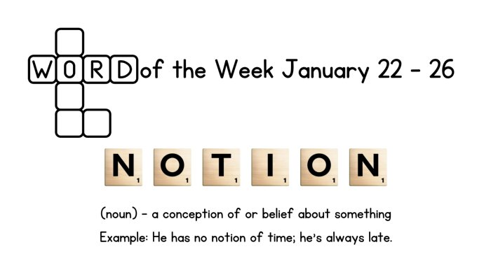 Our new word of the week is NOTION. The definition of notion is-- a concept, an idea, or a belief about something. It can be understood as a basic idea about a topic, or a general understanding. For example, most of us have a general notion of how computers work, but most of us would not be able to build a computer from parts.